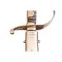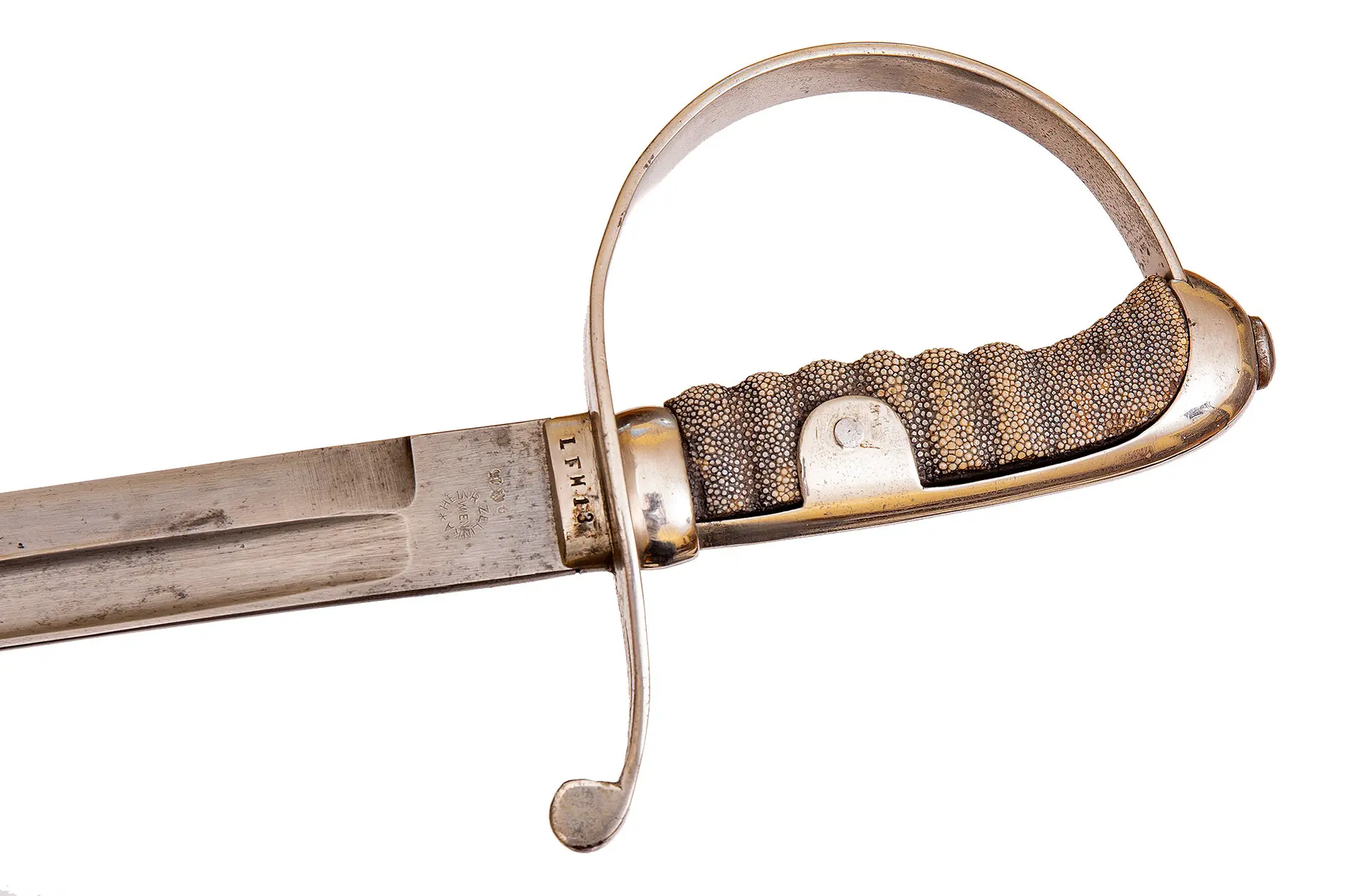 Эфес состоит из рукояти и гарды. Рукоять деревянная, обтянутая акульей кожей, с поперечными желобками. Спинка рукояти стальная, прямая, имеет утолщение по центру, на котором помещена заклепка, фиксирующая рукоять. Гарда металлическая, с одной D-образной защитной дужкой с вырезом для темляка в нижней части. Дальний конец чашки загнут по направлению к обуху клинка. Ножны стальные с прибором, состоящим из вставного устья, двух обоймиц со скобой и неподвижным кольцом для ремней портупеи и асимметричного башмака.